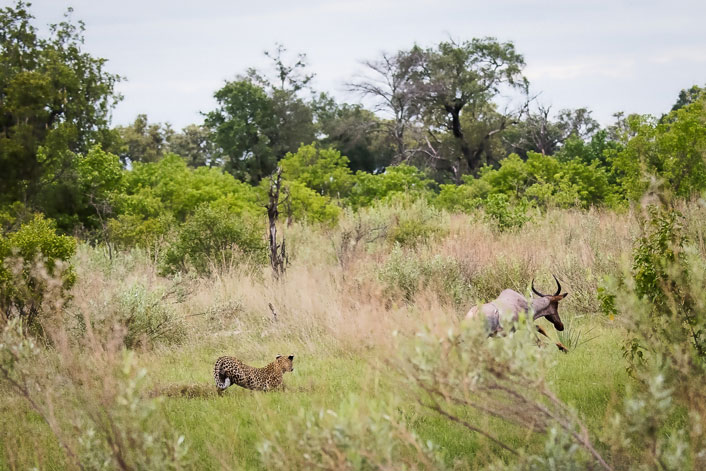Das Wecken heute morgen um 5:00 halb so schlimm. Der Blick aus dem Zelt nach Osten, wo schon ganz leicht unter den Wolken der Sonnenaufgang beginnt. Kurzes Frühstück um 5:20, auf den Landcruiser um 5:40 und hinaus in den noch kühlen afrikanischen Morgen. Der Himmel wolkenverhangen, deshalb angenehm kühl. Unsere beiden Guides fanden schnell die Spuren der Predatoren, nehmen sie auf und führen uns auf den Weg zu Ihnen. Plötzlich nehmen sie einen „Alarm call“ von Impalas wahr und machen sich auf den Weg. Und fanden sie! Eine wunderschöne etwa 16 Monate alte Leopardin. Überhaupt nicht scheu, noch einigermaßen verspielt und körperlich unglaublich gut in Schuss. Auf einmal setzt sie zur Jagd auf eine Zezebe Antilope an, die noch viel zu groß für sie war. Utes Film zumindest ist Klasse geworden. Wir verlassen das Mädchen nach einer Weile und sucheen weiter, orientieren an Warnschreien einiger Paviane. Ein ziemlich scheuer Leopard wurde im hohen Gras gesichtet. Wir verfolgen dieses herrliche Tier, konnten es jedoch nicht richtig stellen, da viel zu unruhig und auf der Flucht von uns.