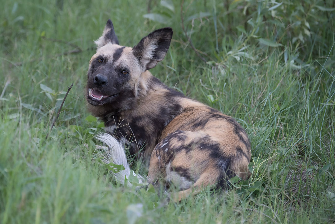 Wir sichten vom Außenbereich des Restaurants im Camp zwei Wild Dogs.