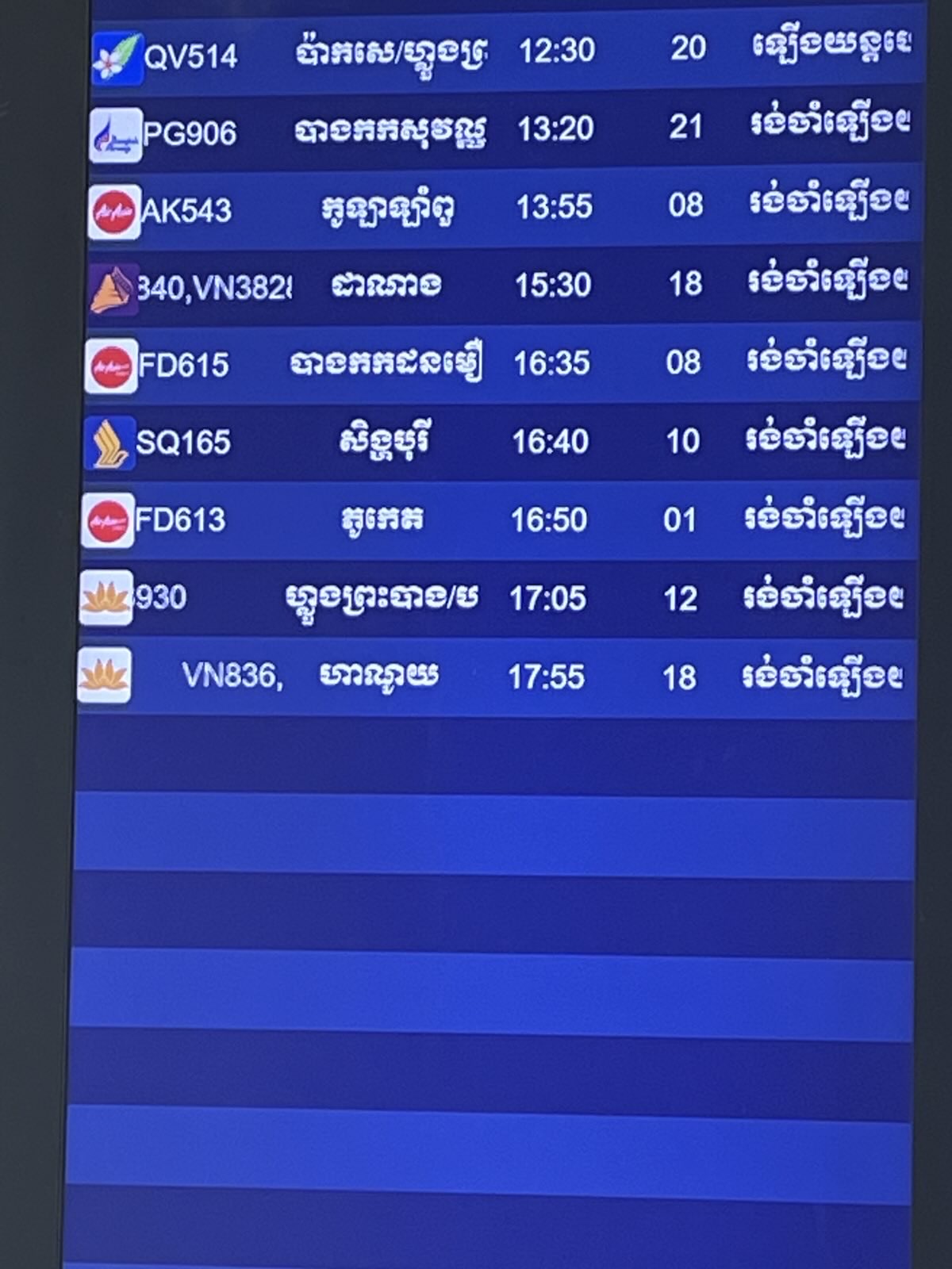Unsere Maschine der Bangkok Air kommt pünktlich rein, eine kleinere Propellermaschine wie wir sie aus Afrika kennen. Etwas mehr als eine Stunde Flug. Das ganze Land wirkt von oben abgeholzt. Dann erreichen wir den Luftraum von Bangkok. Tja, ist eben eine 12 Mio. Stadt. Immigration wieder easy. Erst mal Bargeld und ne SIM-Karte. Ist schon ein etwas andere Preisgefüge hier.