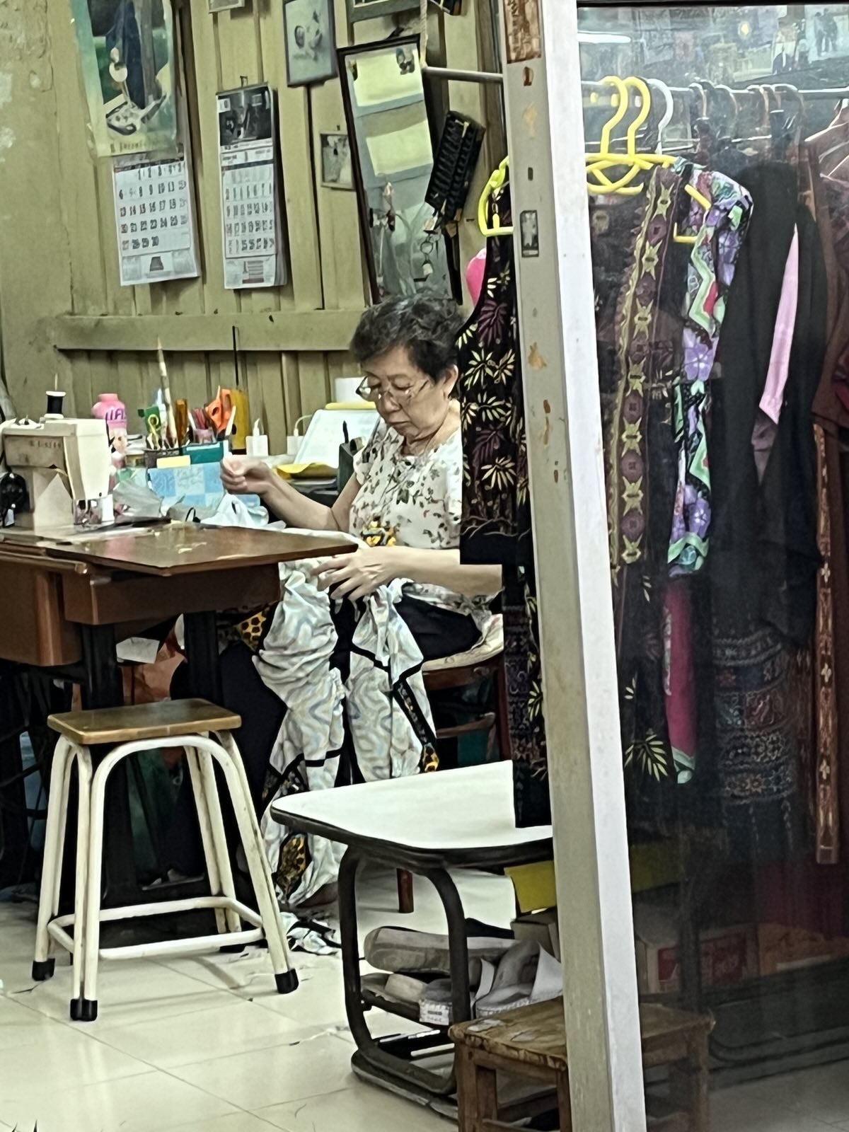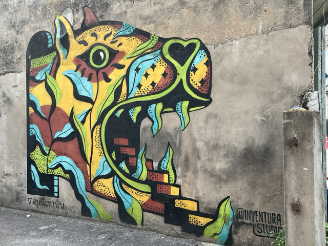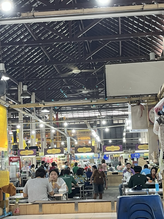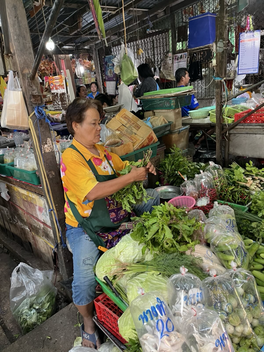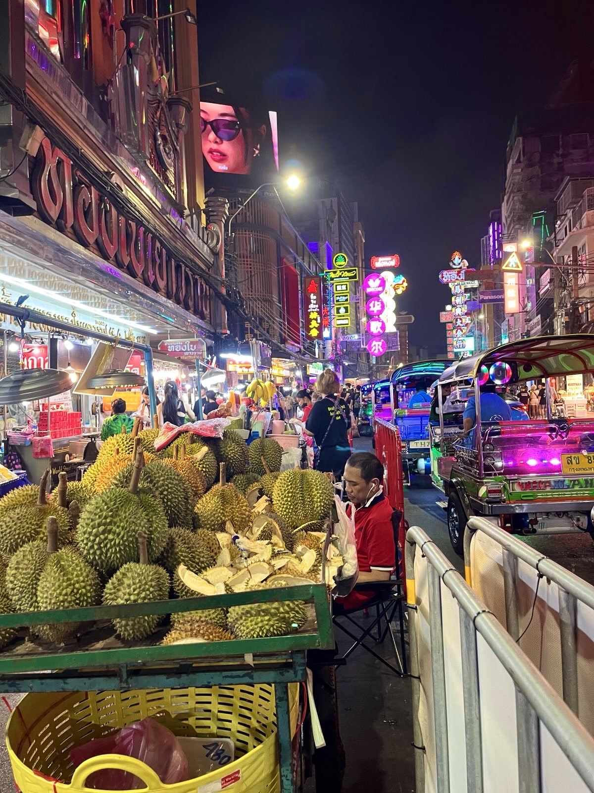 Heute Morgen mal ohne Tempel. Der Weg führt uns eine viertel Stunde entfernt ins Nang Loeng Viertel und dort auf den Nang Loeng Markt. Die Welt hat 2018 einen schönen Artikel mit der Überschrift In Bangkoks Viertel Nang Loeng findet man noch das alte Thailand veröffentlicht, der uns motiviert, den Markt zu besuchen. Nomen est Omen. Auf dem Weg dahin finden wir eine Apotheke. Der Apotheker verkauft mir einen Streifen Laxoberal. Eine ganze Schachtel wäre ja zu viel für mich. Ein geschäftiges Gewusel, viele Streetfood-Stände, viele freundliche Menschen, aber auch misstrauisch und unfreundlich schauende Frauen. Ist ja nachvollziehbar. Eine alte Frau lächelt uns an und sagt „Guten Morgen“. Freundlicher Augenkontakt, wie mit einigen anderen. An der Ecke ein kleines und herrlich unperfektes Kaffee. Elektronik beim Bezahlen wie im IT-Zentrum, für den ganz großartigen Latte Macchiato braucht es drei Menschen und eine gefühlte Ewigkeit. Das moderne Leben auch in Thailand. Mit allen Ecken und Kanten. Durch die Glastür können wir das Treiben auf dem Markt schön beobachten. In Summe zwei herrliche Stunden hier.