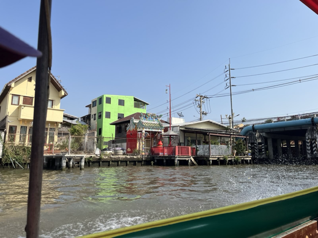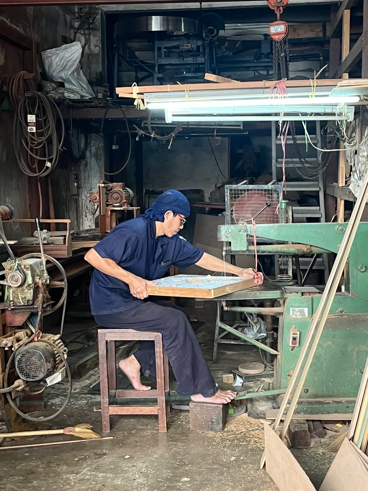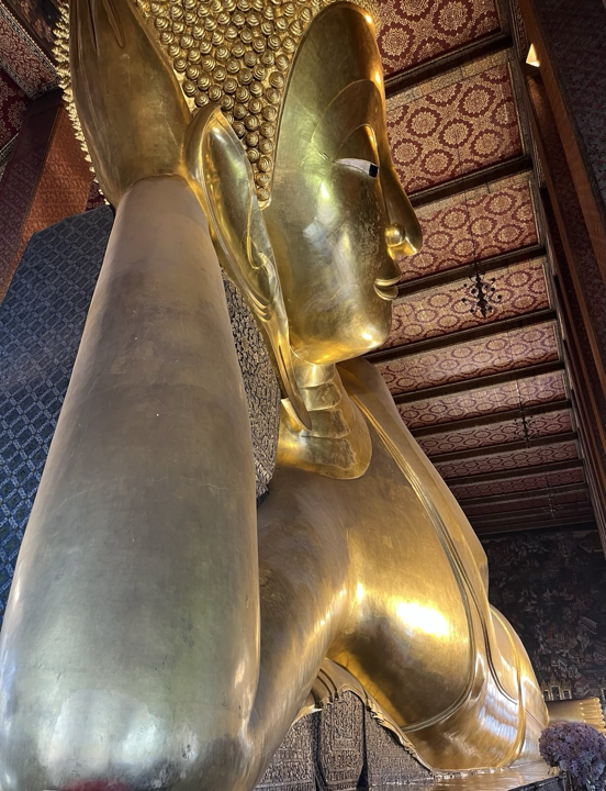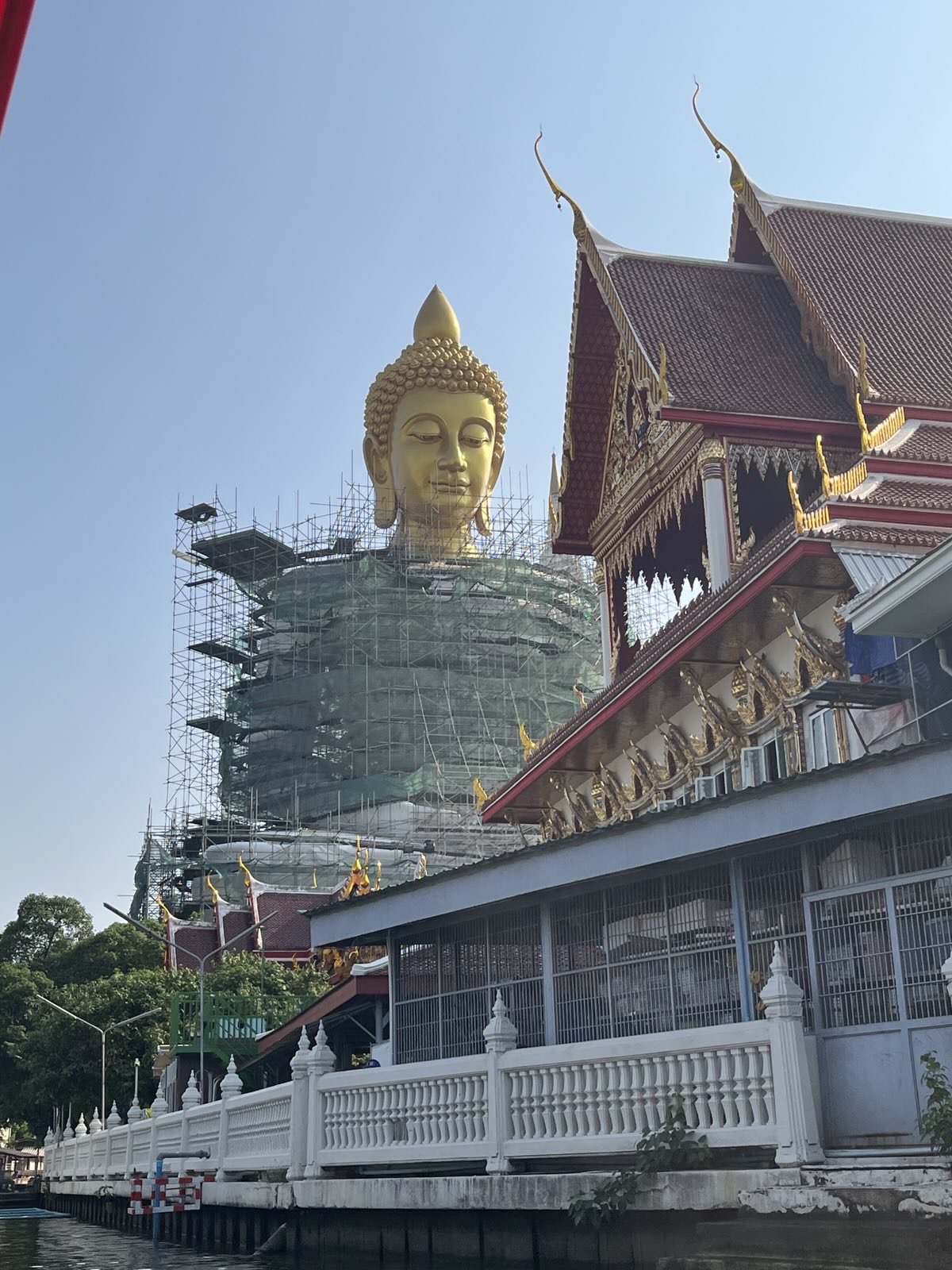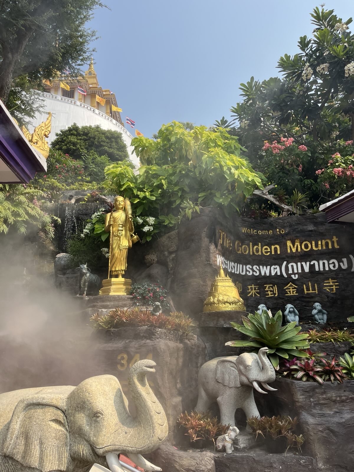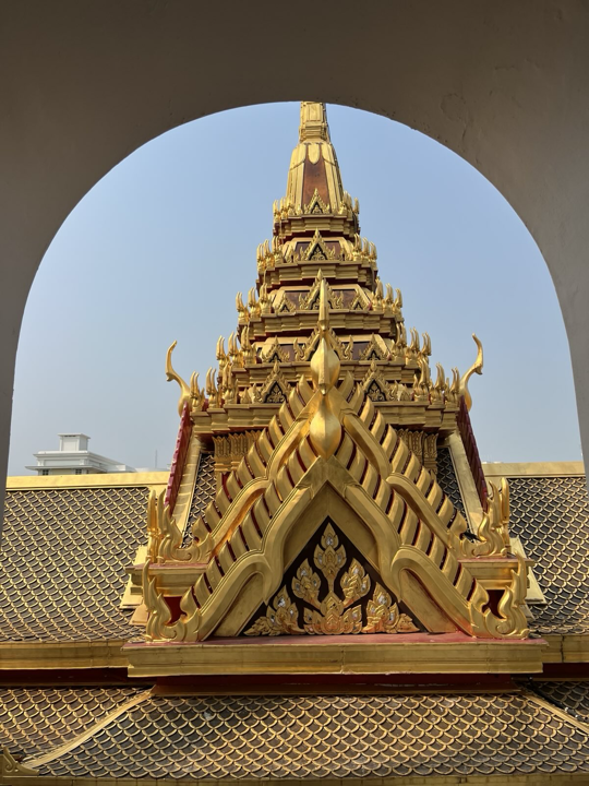 Zu Fuß ein paar Meter um das Mahakan Fort über die Brücke am Ferry Stop Bobae Market vorbei. An der Straße laufen wir an einer Schreinerei vorbei und beobachten eine ganze Weile den Mann an der Säge wie er konzentriert vorgezeichnete Muster aussägt. Er freut sich über unser Interesse und lächelt uns zu. Ein paar Meter weiter und hinein in den Tempel Wat Saket mit dem Golden Mount. Der Tempel der zweiten Klasse gilt als eine der Top-Sehenswürdigkeiten Bangkoks. Ist auch wunderschön. 344 sanfte Stufen vorwiegend in üppigem Grün führen die künstlich aufgeschütteten 80 Höhenmeter zur goldenen Kuppel hinauf. Jede Menge Buddhas, kleine Schreine, Glockenwege, alles sehr schön in Schuss gehalten. Die Ruhe erzeugt eine friedliche Atmosphäre. Ein leichter Wind kühlt uns etwas herunter. Oben angekommen haben wir einen weiten Blick über Bangkok. Eine schöne erste Runde vom Hotel aus. Knapp zwei Stunden später Rückzug vor der großen Hitze ins klimatisierte Hotel zu einem Eiskaffee. Auf der Baustelle arbeiten die Menschen wieder dick eingemummelt mit Helm. Es muss doch barbarisch sein. Die Moped- und Rollerfahrer quetschen sich an den stehenden Autos vorbei. TukTuks mit Touristen rollen am Fenster vorbei. Viele BYDs und MGs, wenige Mercedes, Porsche und BMW. Spannendes Treiben.