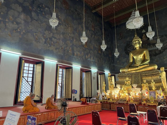 Nachmittags zwei weitere Tempel. Nicht lachen, weil es für uns sehr „strange“ klingt. Einmal den Wat Ratchanardaran und dann den kleineren Wat Thep Thidaram Worawihan. Außer uns kaum „weiße“ Touristen. Beeindruckende Gebäude. Ersterer mit sieben Stockwerken. Auf jedem Stockwerk eine andere Art zu meditieren. Mal im Gehen, mal im Sitzen. Vom obersten Stock eine wunderbare Rundumsicht auf die Altstadt von Bangkok. Der zweite Tempel sehr klein, beherbergt einen weißen Buddha. Die Wände zauberhaft angemalt, eher ein Tempel für den täglichen Gebrauch. Ute meint nur, ein Staubwedel wäre ab und zu ganz angebracht. Die Ruhe in den Tempeln und die Art der Besucher und Betenden stecken an. Innere Ruhe kehrt ein, sogar bei mir. Gegen 16:30 ist wieder das „Chanting“ der Mönche zu hören, wie uns John in Siem Reap beigebracht hat. Immer vor dem Essen. Wir folgen den Klängen und erleben ihr Ritual.