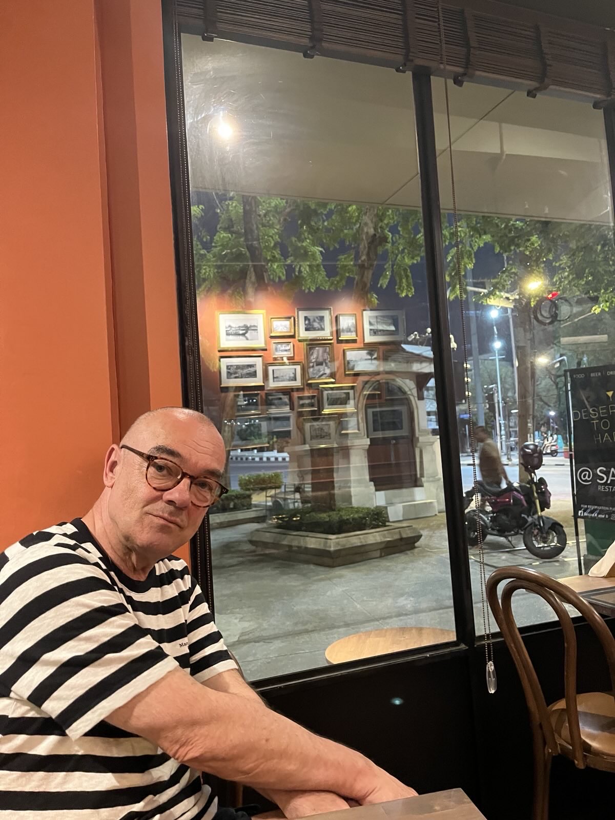 Es reicht und geht mit dem Van 90 Minuten zurück. Rush Hour. Nach der Ankunft kurze Verhandlung mit ein paar Taxifahrern. Viel zu teuer. Also doch GRAB. Eine weitere extrem spannende Stunde für die Heimfahrt. Jetzt wird der Begriff des chaotischen Verkehrs hier klar. Wir stauen durch Häuserschluchten, um uns rum riesige Werbetafeln, Tiger Balm wirbt mit FC Bayern und in riesig großen Bildern posieren Thomas Müller und Harry Kane. Eine Fahrt wie ein Film. Entsprechendes Trinkgeld. Kurz in den Pool gesprungen. Wir haben das Dach für uns. Über die riesige Kreuzung in sechs herausfordernden Abschnitten. Ein kleines Restaurant Sasira unser Ziel. Unten keine 10 Plätze, nur vier mit uns belegt. Lecker Bier, lecker Essen, grandiose Atmosphäre. Wieder zurück, der Verkehr läßt nach. Noch zwei Gin & Tonic - was für ein rasanter Tag.