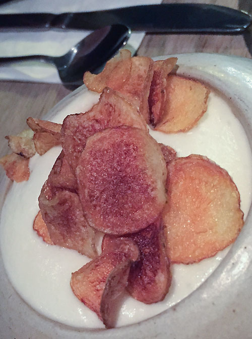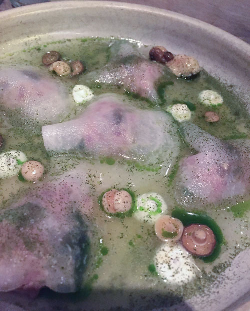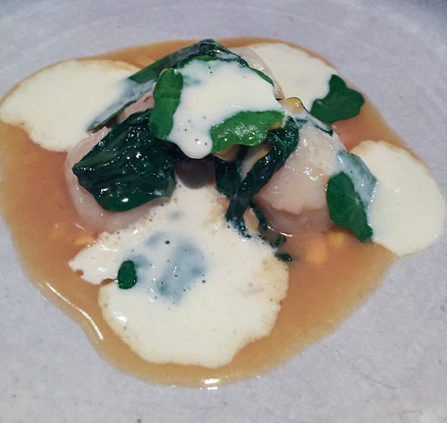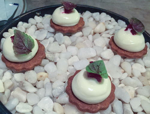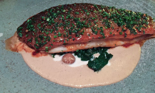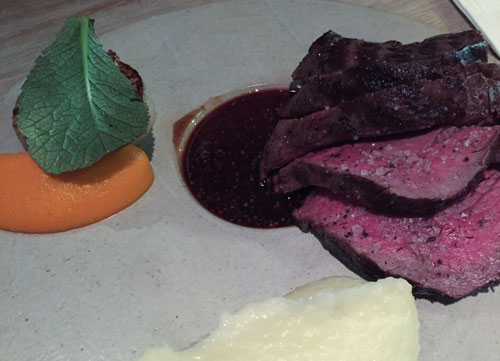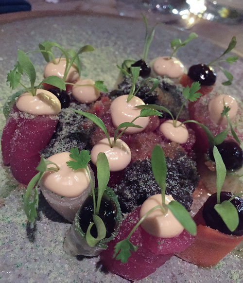 Wir können auch zu viert nur eine Flasche Rotwein trinken. Gruß aus der Küche (Tomaten Gazpacho), sechs unterschiedliche Vorspeisen (Thunfisch Sushi und was weiß ich noch) in zwei Runden (siehe Bilder) und drei Hauptspeisen mit gewürztem Goldbrassenfilet, Entenbrust und rosa gebratenem Rehfilet. Als Wein hab ich ne Flasche Roten ausgesucht: 2T, Yarden, Golan Heights. Basiert auf portugiesischen Reben.
