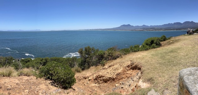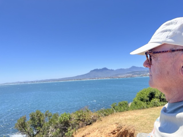 Typische Orientierungsphase mit ups and downs. Ganz normal. Deswegen heute bei herrlichstem Wetter ein Ausflug an die nahe Küste und dort den Beach Drive in Harbour Island an der R44 zum Whale Watching Point und ein paar anderen View Points. Eine herrliche Strecke, eine herrliche Aussicht aufs Meer. Wie hat sich ein holländisches Kaffeegespräch ausgedrückt: Man fühlt sich so klein hier. Er hat ein Ingenieursbüro in Spanien, lebt da auch viel und hat direkt über dem Platz, an dem wir gerade sitzen, eine Wohnung mit weitem Blick über die herrliche False-Bay. Wir tauschen uns nett aus, er fährt mit seinem Range Rover wieder den Berg hoch. Bei all dem Luxus, den die Häuser am Bergrand ausstrahlen, ist uns zu weit vom Schuss. Er hatte die Wohnung während Corona gekauft als die Preise im Keller waren. Mittlerweile steigen sie gewaltig. Haben wir auch schon festgestellt. Weiter an der Straße mit herrlichem Blick aufs Meer. Immer wieder kurze Pausen, um das Licht, die traumhaften 25 Grad und die Aussicht zu genießen. Das Meer mit seinem satten Blau, in der False Bay auch mal Türkis. An den Berghängen blüht es gelb und blau.