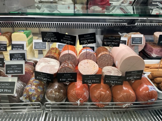 Zurück nach Somerset West, geht’s bei uns um die Ecke wieder zum SPAR. Heute warten keine Menschen an der Wursttheke, so ergibt sich die Muße, diese zu betrachten. Unfaßbar - vom deutschen Metzger. Daneben liegen die Christstollen. Ein wenig Heimat brauchen die deutschsprachigen Rentner um uns herum doch auch.