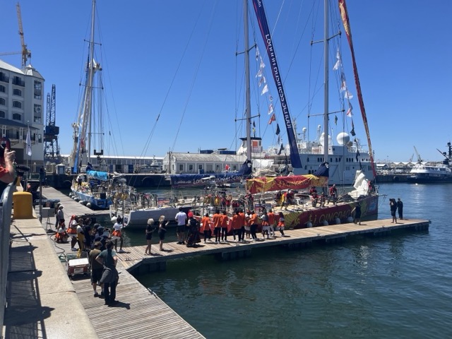 What a day. Heute musste es einfach Kapstadt sein. Sind ja nur 40 Kilometer auf der N2. Nach dem ausgesessenen morgendlichen Stau nur knappe 40 Minuten. Wieder vorbei an Kayelitsha auf der dreispurigen bestens ausgebauten Autobahn hinein in die Mother City. Ja, die abgebrochene Autobahnbrücke ist noch da. War schon zur Fussball-WM 2010 der Fall. Viele neue Hochhäuser, alles schick. Parken an der V&A Waterfront im Parkhaus. War das letzte Mal (2013) auch noch nicht existent. Eine eigene Welt. Natürlich ist die V&A Waterfront touristisch, natürlich ist sie sehr teuer. Aber so schön. Ja, eine große Menge Deutscher. Aber die wissen ja nicht ;). Unser Ziel das Jetty 2 am Pier 1. Hier sollen die Boote vom „Clipper Round The World Yacht Race“ liegen. 10 Yachten, bestückt mit Privatpersonen, so 17 pro Boot, die um die Welt segeln. Und heute sollen sie hier ankommen. Zwei Boote liegen schon da. Müssen ganz frisch gekommen sein, da das musikalische Empfangskomitee, das später das dritte Boot mit herrlicher afrikanischer Folklore begrüßt, uns im Parkhaus begegnet ist. Die Frauen und Männer an Bord sind schon verdammt abgerockte Typen. Von 23 Jahren bis 68 und von überall auf der Welt her.