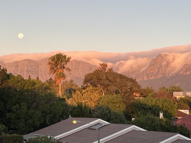 Zurück zum Morgen. Heute Nacht ein verrückter Vollmond über dem Helderberg. Die ganze Bucht bis runter nach Sands im hellen Mondlicht. So starker Wind, ebenso wie jetzt gerade, dass wir die Fenster nachts nicht öffnen konnten. Etwas schwierig aber was für eine Ruhe.