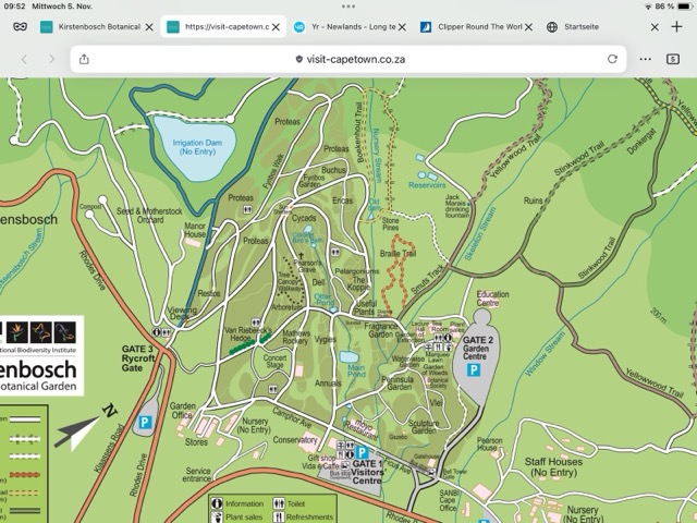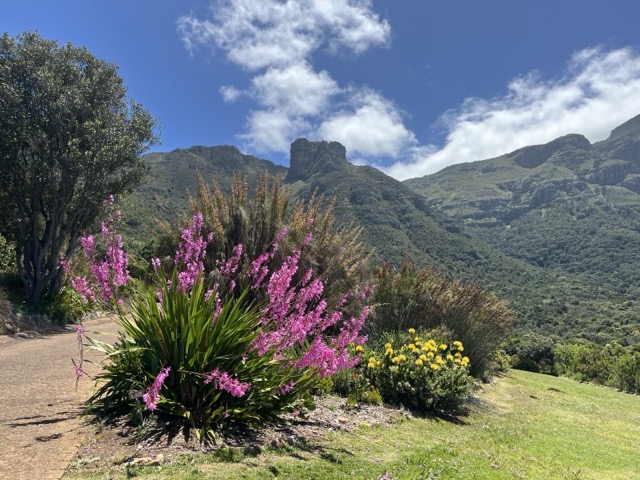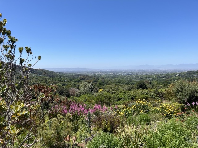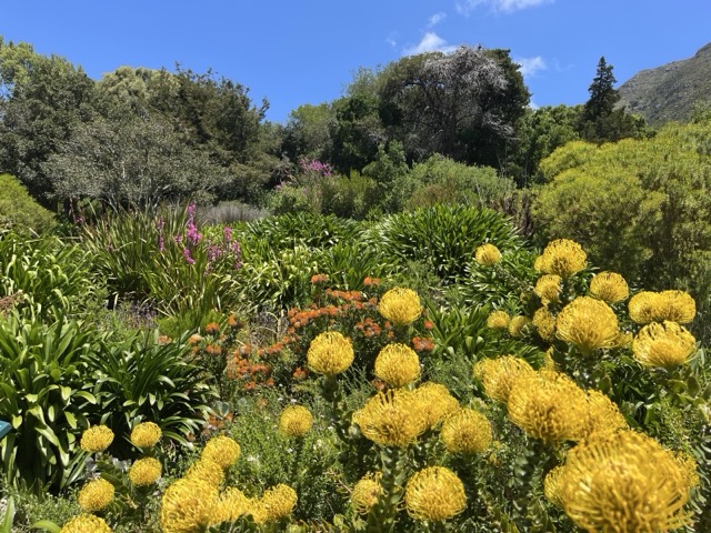 Heute morgen ab nach Kirstenbosch, dem botanischen Garten von Kapstadt. Ist das verrückt? Unser insgesamt dritter Besuch in dreißig Jahren und wieder komplett begeistert. Wie ein großes, grünes Refugium. Zweieinhalb Stunden spazieren durch das satte Grün unterhalb des Tafelbergs. Wir lernen, dass der Tafelberg vor 250 Millionen Jahren einmal der Talgrund war. Heute eine prominente Erhebung über der Mother City. Es blüht und grünt, Proteas in allen farblichen und strukturellen Schattierungen, Vögelzwitschern, Grashüpfern und was weiß ich noch. Seelenbalsam mit dem weiten Blick auf Kapstadt. Ruhe im Inneren, etwas mehr Klarheit, wie es weitergeht.